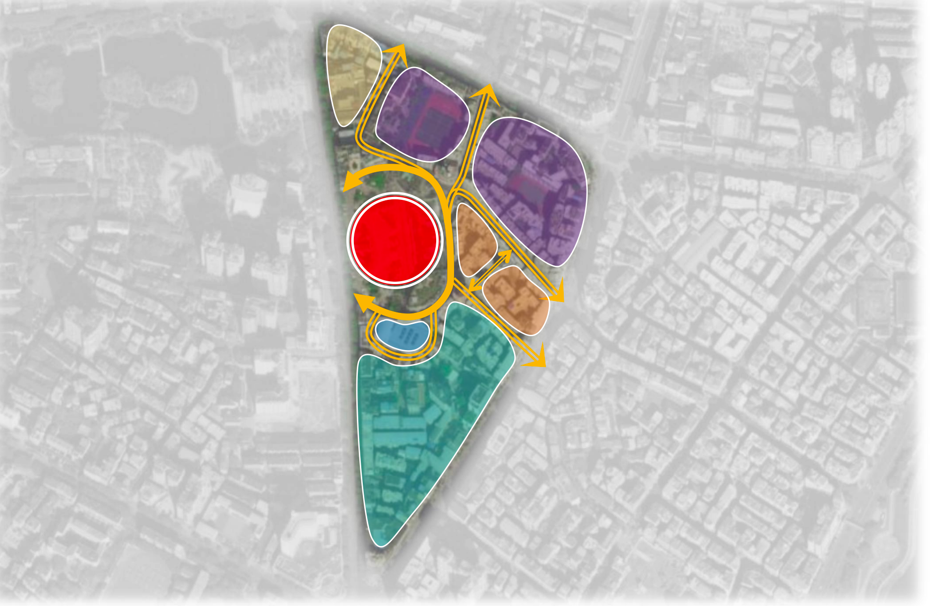 城市繁华中心(2024年至今):2024年5月1日,环形中心外广场亮相;10月1日,项目首阶段焕新呈现。「环形」二字,取自那条400米的环形跑道,也取自「焕新」的谐音。环形中心商场部分总建筑面积约4.8万㎡,总投资1.5亿元,定位为“都市青年能量场”,集成消费场、创意场、生活场,打造“艺术+生态+文化+社交”的公园式商业街区。