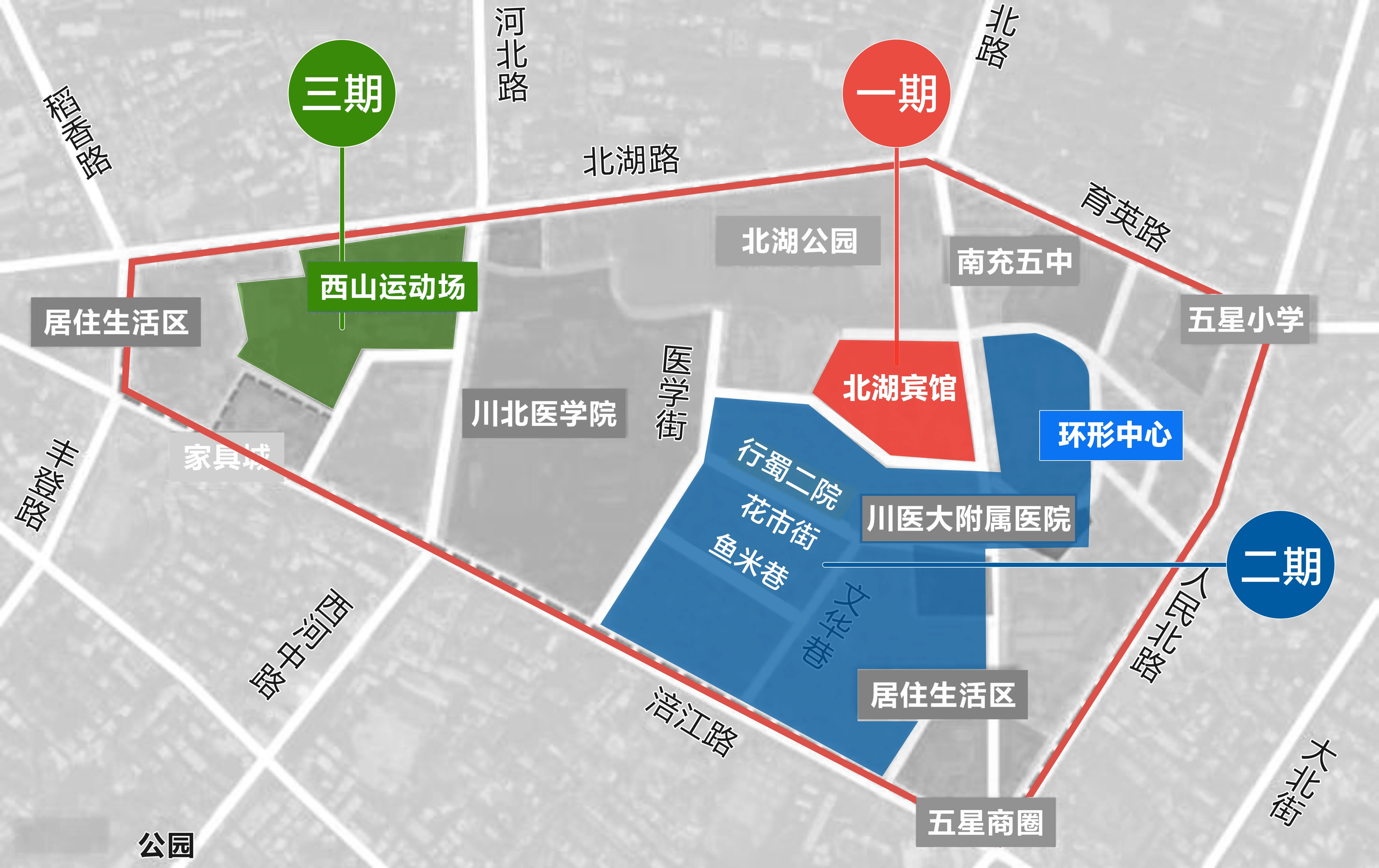 环形中心位于顺庆区的北湖片区,该片区是南充城市更新的重点区域。项目本身是顺庆区主城更新十大行动的重点项目之一,承担着老城焕活的功能。其所处的“顺庆第一金街”是南充最核心的传统商圈。而它的另一个身份,是老城区的交通焦点:多条主干道与公交线路在此交汇,到火车北站或高坪机场均不过半小时车程。