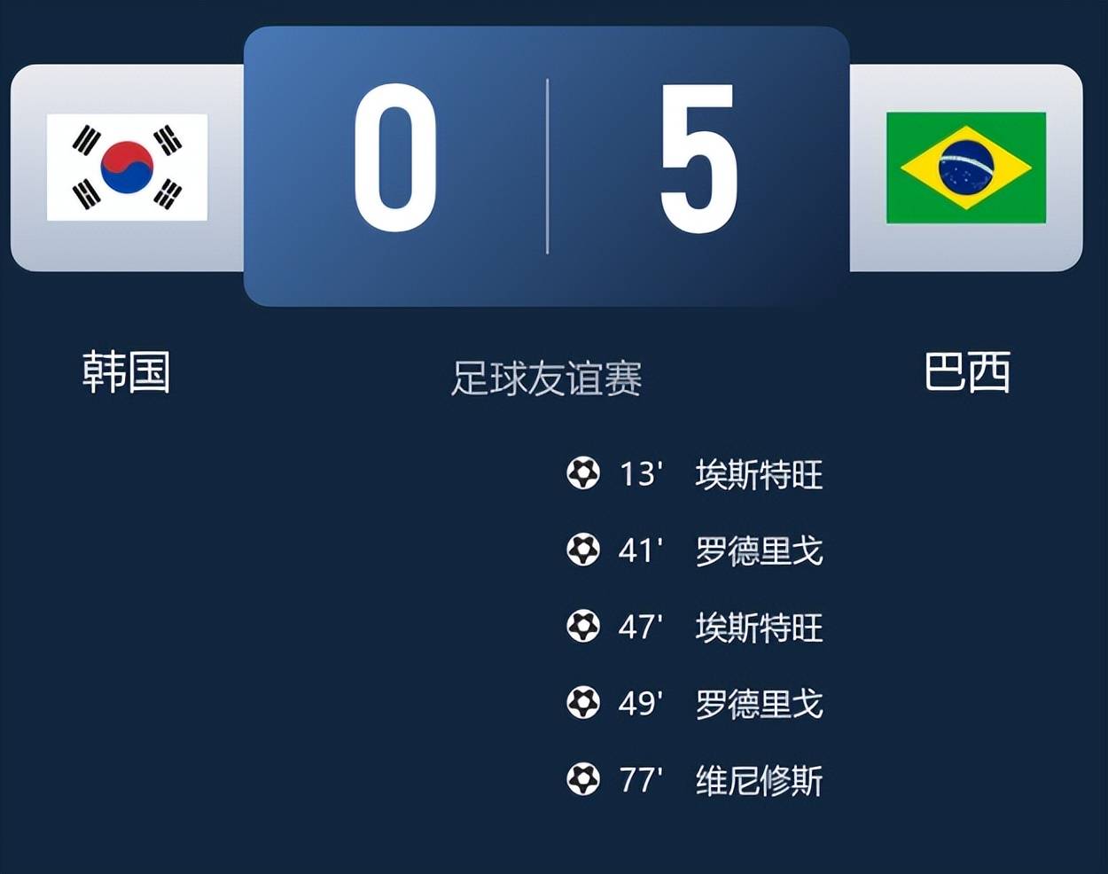 进入下半场,韩国队的防线再度出现致命失误。金玟哉在本方禁区内被断球,埃斯特旺抓住机会梅开二度。随后,韩国队在中后场的位置上再次出现丢球,罗德里戈也抓住机会完成了个人第二粒进球。比赛的最后阶段,库尼亚助攻维尼修斯破门,维尼修斯也完成了传射建功。最终,韩国队在这场主场比赛中以0比5惨败于强大的巴西国家队。